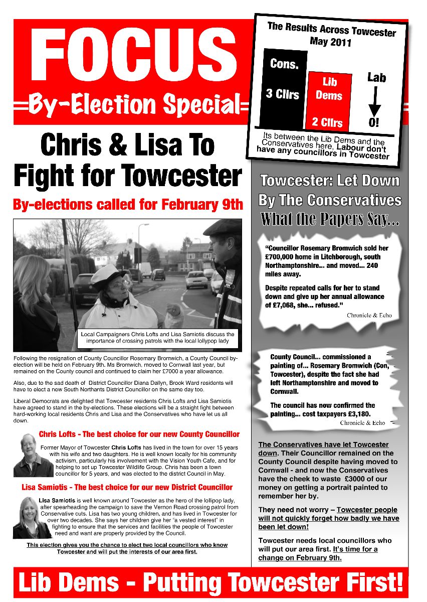 South Northamptonshire is a Lib Dem good news story. In February 2011 we targeted five wards in and around Towcester. In May 2011our team won two seats in the Towcester Brook Ward – our first two on the council. In September they won an ALDC award for their campaign. After conference the third district councillor in Towcester Brook,a Tory was diagnosed with cancer and as the Tory county councillor for Towcester had already moved to Launceston in Cornwall both by-elections were called together.