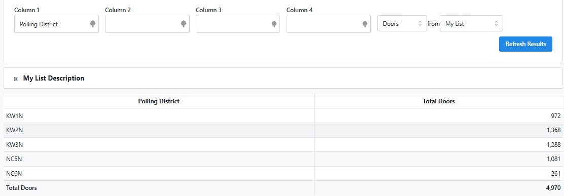 You then need to check if any of these postcode sectors extend into other wards. Go back to Create a List and then under Addresses type a Postcode Sector and run the search. Then Run Counts and Crosstabs again this time selecting Polling District under column one. This will show you the total number of doors in each polling district in that sector.