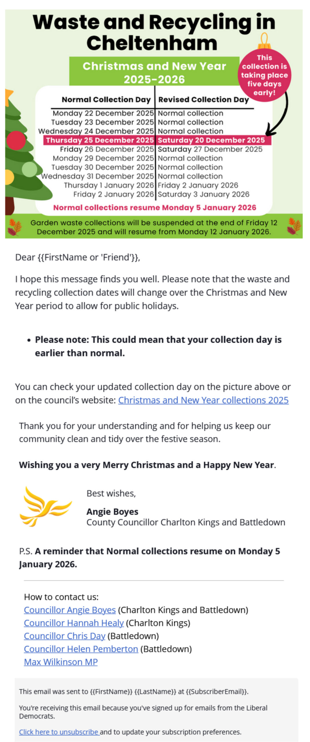 The really important thing is that you send an email like this to your list in the run up to Christmas. It is a great service you can provide your community to just remind them of bin date changes.