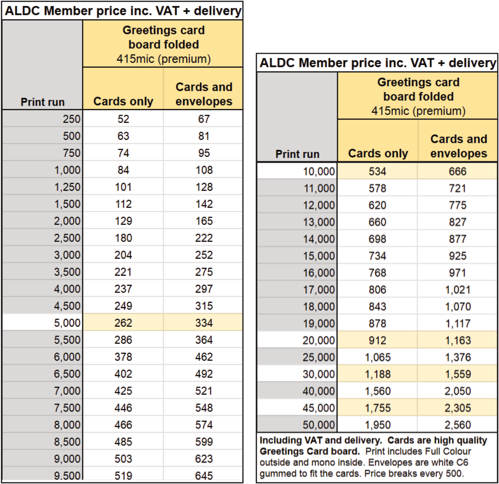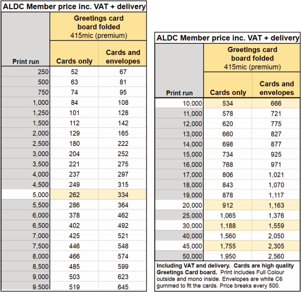 ALDC member discount prices for your Christmas Cards are below. This includes VAT and Delivery. You can order your Christmas cards on their own – or with envelopes. We would always recommend stuffing your cards into envelopes. Just like a normal Christmas Card. This will give them the greatest impact when delivered to residents.