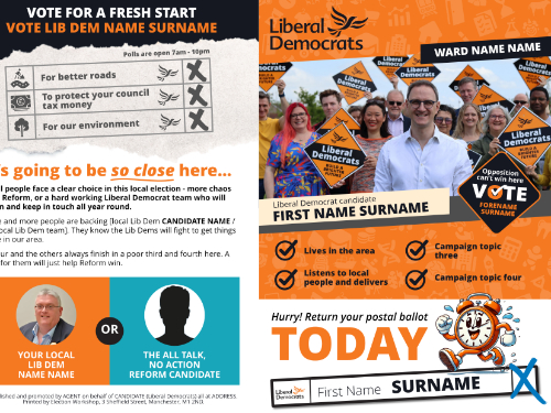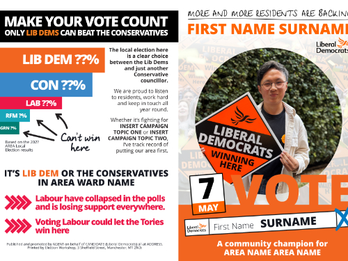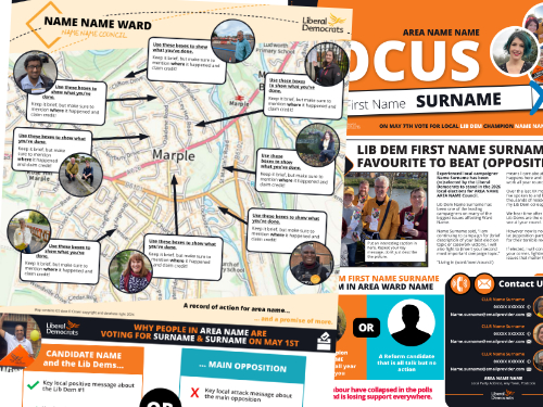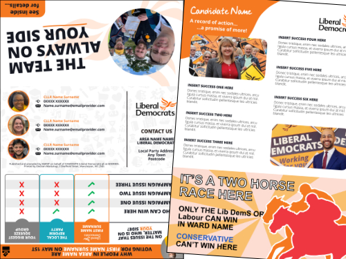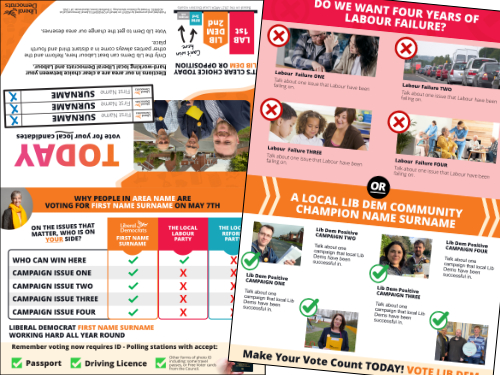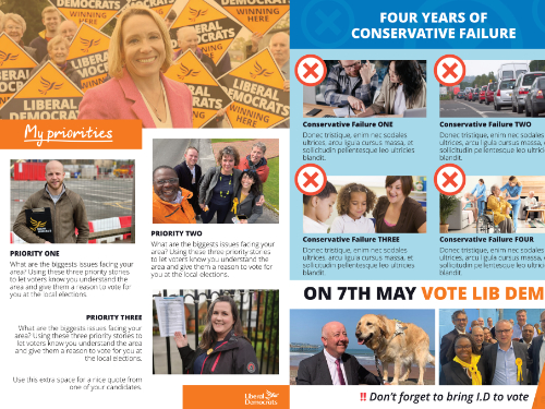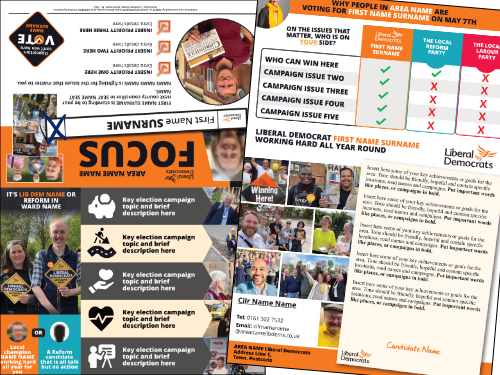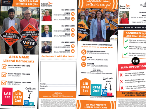 At ALDC we like to give you all your templates well in advance – so you can plan ahead and get ahead. On this page you will find leaflet templates to take you all the way up to your final knock up leaflet of polling day. Templates include new Focus Leaflets, Calling Cards, Mailings, Polling Week Materials and of course the Three Leaflet Deal which this year includes five leaflets (Flying Start, Map Leaflet, A4 Leaflet, Candidate Leaflet and Flying End Leaflet).