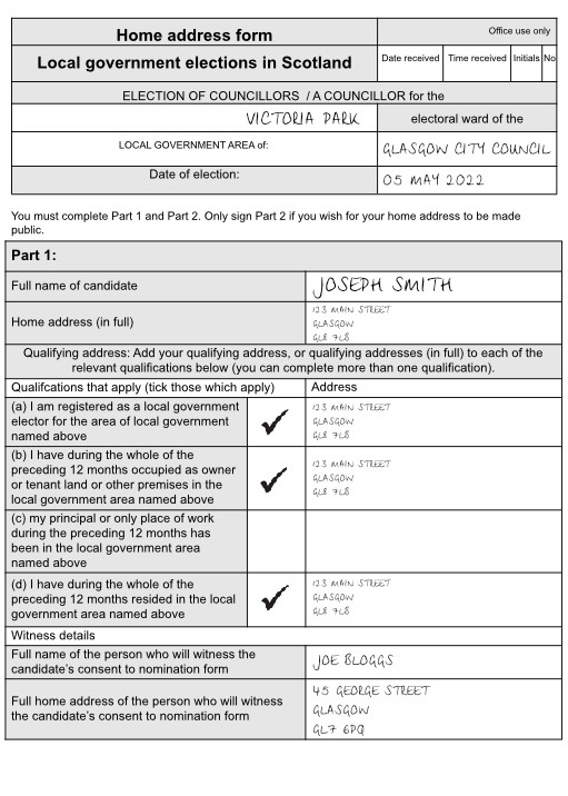 Part 1 – You must provide your full name and full home address. Then you should tick all of the qualifying criteria that apply to you that allow you to stand. These are the same criteria covered in the Nomination Form. For each that apply tick the accompanying box and then provide the full address or addresses that confirm that you meet this criteria.
